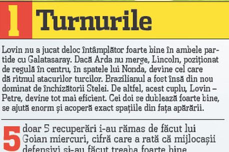 Lăcătuș avea de ales între eroul de la Bistrița și un al doilea închizător. Altfel spus, avea de ales între prudență și exuberanță ofensivă. A pornit cu judecata de la rezultatul meciului din tur, ajungând la concluzia că este mai util Lovin lângă Ovidiu Petre. Apoi, l-a izolat pe Arda. Iar cu Arda anihilat, zona din fața careului devine crucială, pentru că Galatasaray se refugiază în tendința, poate involuntară, de a-și concentra jocul în jurul lui Lincoln, adică pe zonă centrală. Acolo însă a funcționat perfect blocul defensiv de patru oameni, format din fundașii centrali și închizători. Patronul Stelei, Gigi Becali, vorbește frecvent despre credința în Dumnezeu. Este bună pentru că ne face mai buni. Uneori trebuie să credem însă și în oameni, iar acum putem să credem cu tărie în antrenorul Marius Lăcătuș.