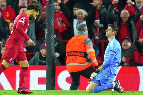 Thibaut Courtois a respins, în primă fază, cu genunchiul, însă în încercarea de a respinge și mai departe a căzut și Mo Salah a profitat și a venit în viteză, trimițând mingea direct în poarta madrilenilor.