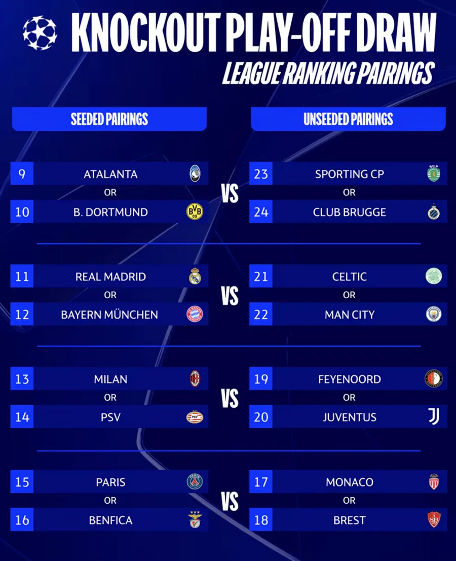 Play-off pentru optimi: 11/12 și 18/19 februarie 2025. Programul complet va fi anunțat de UEFA vineri seară, 31 ianuarie 2025.