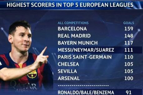 Cei trei oameni de gol ai Barcelonei au marcat împreună 111 goluri în toate competițiile în actualul sezon. Cu alte cuvinte, jucătorii din ofensiva Barcelonei au marcat mai multe goluri decât întreaga echipă a PSG-ului sau decât trupa lui Mourinho. Messi a reușit 53 de goluri, Neymar – 34, iar Suarez – 24.