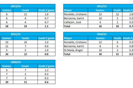 Cei de la Opta au realizat o statistică ce-i privește pe primii trei marcatori ai Realului în cea mai importantă competiție intercluburi și au concluzionat că „tridentul” ofensil al madrilenilor din acest sezon este cel mai eficient din ultimii cinci ani. Tripleta Cristiano Ronaldo – Karim Benzema – Gareth Bale a înscris 19 dintre cele 26 de goluri ale echipe. Statistica defalcată indică faptul că, în acest an, golgheterii Realului marchează 1,1 goluri pe meci, mai mult decât în oricare dintre sezoanele precedente.