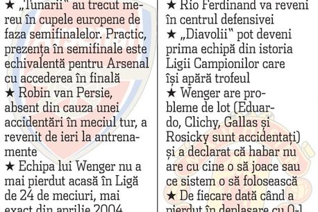 “Diavolii” lui Sir Alex Ferguson au câștigat cu 1-0 în turul de pe “Old Trafford” și au prima șansă pentru un loc în finală. “Trebuia să dăm vreo patru goluri”, spunea scoțianul după prima manșă. “Veți regreta că nu ați mai înscris”, i-a răspuns Wenger. Azi ne vom lămuri care din cei doi monștri sacri din Premier League își va mai trece o finală de Ligă în CV.
