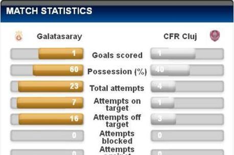 Chiar dacă golul gazdelor a venit târziu, minutul 77, elevii lui Terim au dominat autoritar jocul. Statistica oficială a UEFA demonstrează acest lucru: 60% posesie, 23 de șuturi dintre care 7 cadrate și 9 cornere sunt cifrele care arată că turcii s-au aflat la la conducerea ostilităților. De fapt, CFR a trimis un singur șut pe poarta lui Muslera, dar mingea nu a plecat din piciorul vreunui jucător al echipei române: devierea din minutul 19 a lui Dany Nounkeu, balon ce a intrat în poartă, este singura minge care a prins spațiul porții turce. În afara de asta, clujenii au mai avut doar 3 șuturi spre poarta lui Muslera.