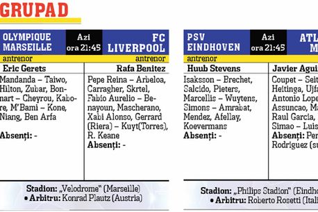 Prima etapă a sezonului 2008-09 al Ligii Campionilor debutează în această seară. În afară de meciurile din grupa CFR-ului: AS Roma – CFR Cluj și Chelsea – Girondin Bordeaux se vor mai disputa 6 partide. Interul lui Chivu joacă la Atena, cu Panathinaikos în timp ce Șahtiorul antrenat de Mircea Lucescu întâlnește campioana Elveției, FC Basel. Cele mai echilibrate dispute ne sunt oferite de Grupa D: Olympique Marseille – FC Liverpoool și PSV Eindhoven – Atletico Madrid.