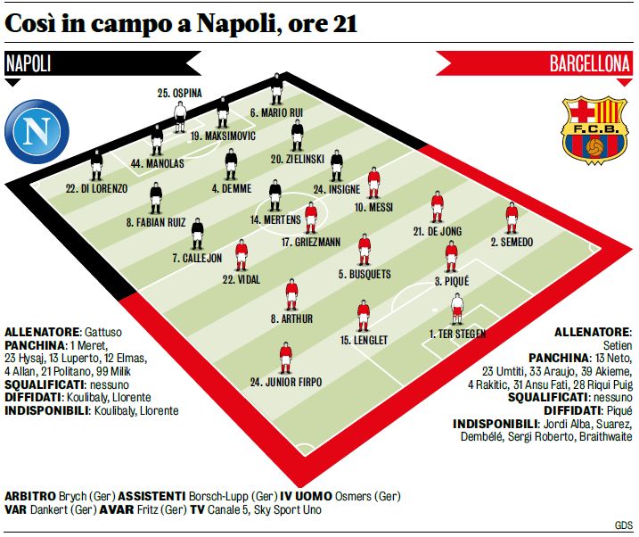Napoli: Ospina – Di Lorenzo, Manolas, Maksimovic, Mario Rui – F. Ruiz, Demme, Zielinski – Callejon, Mertens, Insigne
