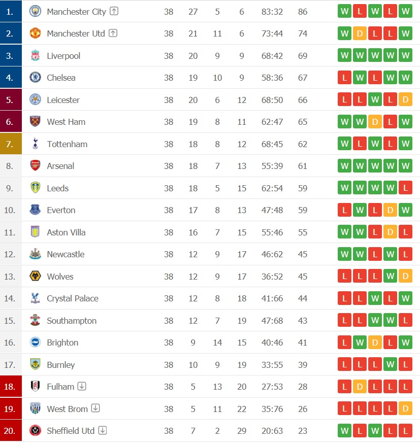 Manchester City este campioana Angliei, cu 86 de puncte, în timp ce podiumul este completat de rivala Manchester United, cu 74 de puncte.