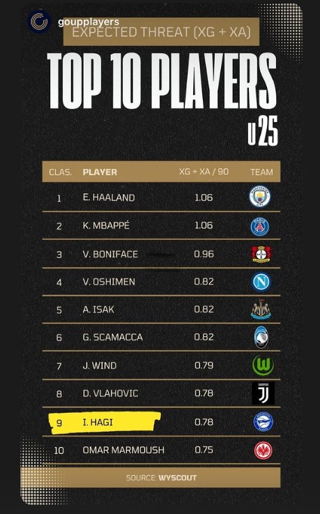 Celălalt star al naționalei Nigeriei, Victor Osimhen, golgheterul lui Napoli, se clasează pe locul 4, cu un punctaj de 0.82. Pe locul 5 este Alexander Isak, atacantul lui Newcastle, pe 6 Gianluca Scamacca de la Atalanta, iar pe 7 Jonas Wind de la VFL Wolfsburg.