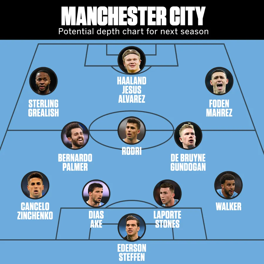 Cum ar putea arăta Manchester City în sezonul 2022-2023: Ederson – Walker, Laporte, Dias, Cancelo – De Bruyne, Rodri, Bernardo Silva – Foden, Haaland, Sterling.