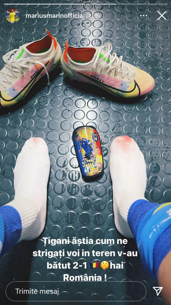 „Țiganii ăștia, cum ne strigați voi pe teren, v-au bătut 2-1. Hai, România!”, a scris Marius Marin pe contul său de Instagram, iar la câteva minute a șters fotografia.