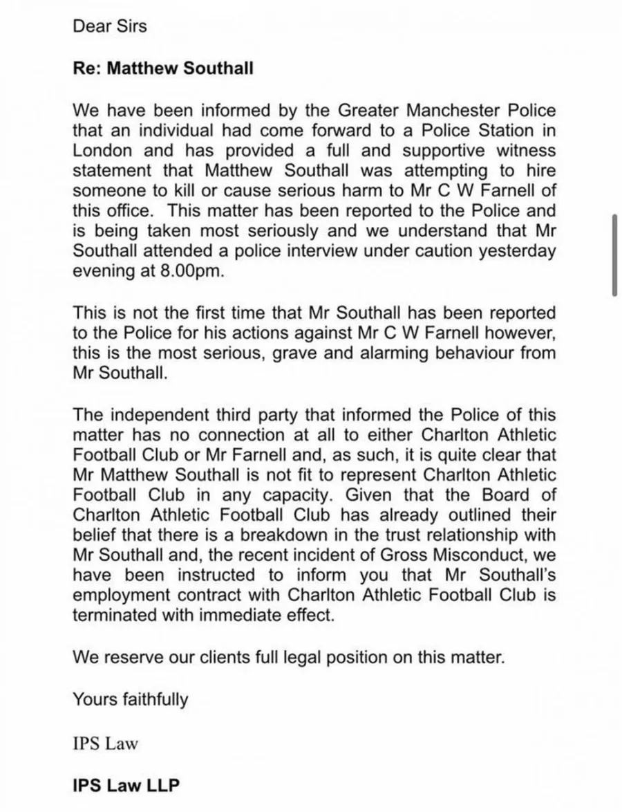 Fostul oficial al lui Charlton riscă să stea mulți ani după gratii. Pe lângă devalizarea clubului, el face și obiectul unei anchete cu o acuzație gravă: a comandat un asasinat. Există o plângere pe numele său prin care se arată că i-a cerut unei persoane să-l asasineze pe C W Farnell, avocatul lui Saeed Bin Tahnoon. Cel care ar fi trebuit să comită crima a mărturisit totul oamenilor legii, iar Southall a primit restricția de a părăsi Marea Britanie. Fostul oficial are deja interdicție de a mai intra în incinta clubului Charlton și are termen să se prezinte la sediul poliției.