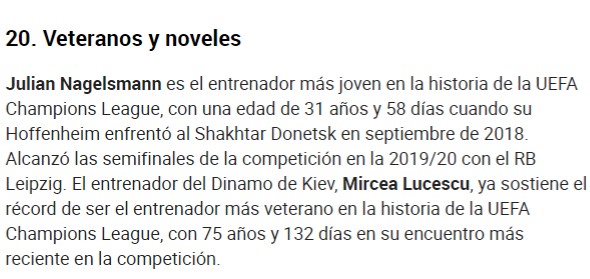 A ajuns în semifinala competiției în 2019/20 cu RB Leipzig. Antrenorul lui Dinamo Kiev, Mircea Lucescu, deține deja recordul de a fi cel mai bătrân antrenor din istoria UEFA Champions League, ajuns acum la 75 de ani și 132 de zile”, scrie publicația spaniolă Marca în ediția de azi.