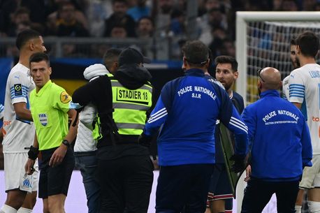 Momente de panică pe Stade Velodrome! În minutul 73 al partidei, argentinianul Lionel Messi a primit o minge la mijlocul terenului, a accelerat în flancul drept, însă s-a trezit pe urmele sale cu un suporter, lansat ca un veritabil atlet.