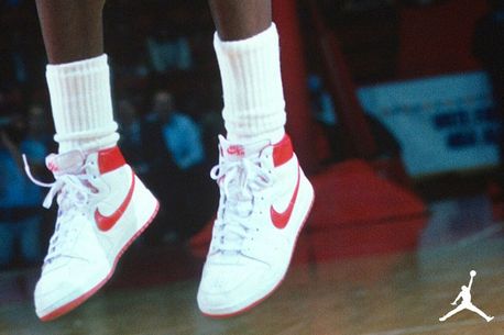 Odată semnat cu Nike, pentru un contract fabulos la vremea respectivă, de circa $500.000 pe an, primul model avea să fie unul alb-roșu, prea mult roșu în schimb pentru conduita celor din NBA, care aveau un regulament strict în privința echipamentului, acesta fiind necesar să fie alb. O amendă de $5000 în fiecare meci în care Jordan purta sneakerșii, dar popularitatea modelului Air Jordan 1 creștea zilnic, iar Nike s-a oferit să plătească bucuroasă fiecare amendă, fiind nevoită în cele din urmă să scoată un model alb. Istoria este bine cunoscută, modelul Air Jordan fiind și în prezent la fel de popular.