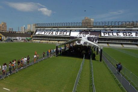 În urmă cu o zi, sicriul cu trupul neînsuflețit al lui Pele a fost depus la Stadionul Vila Belmiro din Santos, la centrul terenului, pentru un priveghi de 24 de ore. Acolo au fost instalate corturi pentru familie, apropiați și autorități, iar publicul a putut să își ia rămas bun trecând pe gazon printr-un traseu organizat (vizibil în galeria foto).