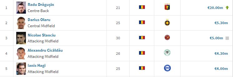 Pe locul 4 este Răzvan Marin, care în iunie 2021 a avut o cotă de 15 milioane de euro, iar pe 5 este Ionuț Radu, care a fost evaluat la aceeași sumă în iunie 2019.
