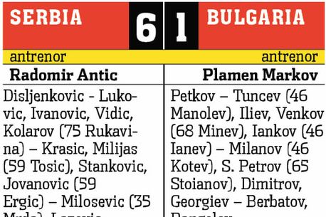 Avem cu adevărat de ce să privim cu pulsul ridicat spre confruntările cu Serbia din 2009. Plavii, conduși de Radomir Antic, joacă tot mai bine și de acest lucru s-a convins Bulgaria în amicalul pierdut aseară la scor de tenis. A fost un meci cu iz de sărbătoare pentru sârbi, pentru că unul dintre marii lor atacanți din ultimul deceniu, Savo Milosevic, recordman de prezențe (102, inclusiv acest meci), a îmbrăcat pentru ultima oară tricoul echipei naționale. El a reușit „dubla“, nu înainte însă de a rata două penalty-uri. Trebuie să privim cu grijă meciurile cu Serbia, întrucât Radomir Antic a fost lipsit la acest meci de aportul a nouă jucători (portarul Stojkovic, fundașii Dragutinovic, Krstajic și Obradovic, mijlocașii Jankovic, Kuzmanovic și Sulejmani și vârfurile Zigic și Pantelic), și cu toate acestea a aliniat un unsprezece foarte puternic.