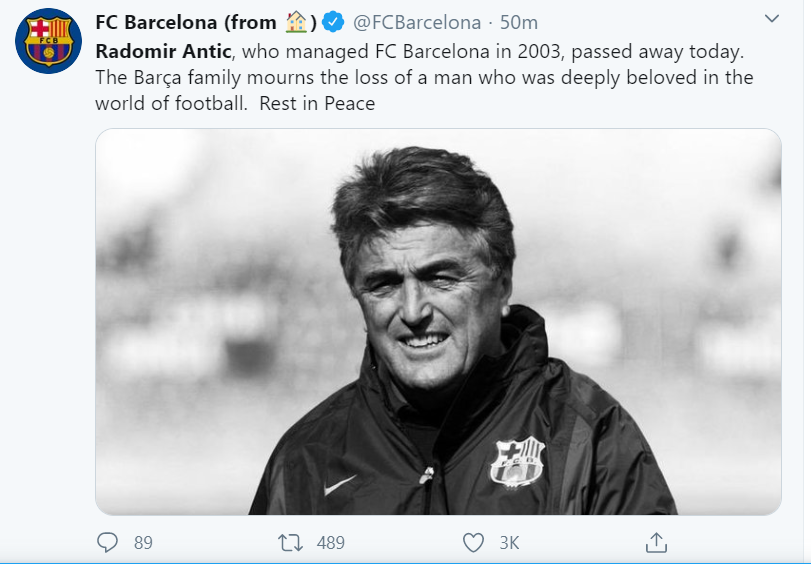 „Radomir Antic, care a condus FC Barcelona în 2003, a murit astăzi. Familia Barça plânge pierderea unui bărbat care era profund iubit în lumea fotbalului. Odihnească-se în pace!”, au scris catalanii.