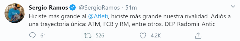 „Ai făcut-o pe Atletico mai mare, ai făcut rivalitatea noastră mai mare. La revedere, după o traiectorie unică: Atletico Madrid, FC Barcelona și Real Madrid, printre altele. Odihnește-te în pace, Radomir Antic!”, a scris Sergio Ramos, pe Twitter.