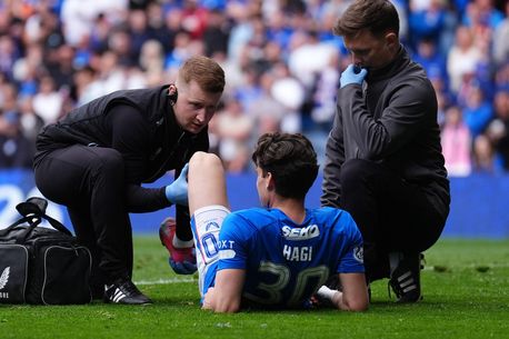 „Hagi a avut nevoie de îngrijiri de la fizioterapeuții de la Ibrox după ce a fost faultat în careu în urma unei intervenții a lui Callum McGregor.