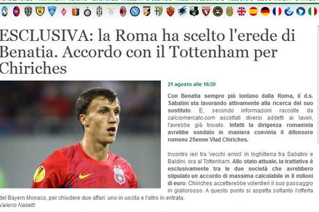 Publicația italiană Calcio Mercato informează exclusiv că AS Roma se află în negocieri cu Tottenham pentru a-l aduce pe Vlad Chiricheș în capitala Italiei. Fundașul în vârstă de 24 ani este dorit pentru a-l înlocui pe Mehdi Benatia, fotbalist curtat de marile cluburi din Europa.