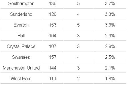 „Spurs este printre codașe într-un clasament al golurilor marcate din corner. Conform Opta și al algoritmului lor de monitorizare, Vlad Chiricheș (în minutul 73 al deplasării de la Fulham) și Etienne Capoue (în minutul 59 al partidei cu City, de săptămâna trecută) sunt singurii care au înscris în urma unor lovituri de colț. În total, Spurs a avut 157 de cornere, astfel că rata de conversie în gol este una foarte scăzuză (1,3%)„, notează jurnaliștii de la skysports.com, care prezintă și un tabel detaliat al acestor tipuri de faze fixe.
