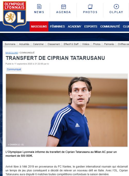 „Olympique Lyon anunță transferul lui Ciprian Tătărușanu la AC Milan pentru suma de 500 de mii de euro.