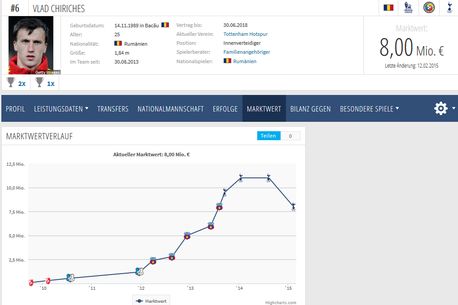 Din păcate pentru Spurs, faptul că Vlad nu joacă a influențat și valoarea și prețul său. Cotat la 8 milioane de euro atunci când a plecat de la Steaua, în 2013, fundașul ajunsese să valoreze 11 milioane în 2014 și să fie primul în topul celor mai valoroși jucători români. Londonezii plătiseră pentru transferul lui nu mai puțin de 9,5 milioane de euro, sumă pe care acum cu siguranță nu o mai pot cere pentru a-l ceda pe Chiricheș la altă echipă. După ce cota sa de piață s-a înscris pe o pantă ascendentă până la sosirea la Spurs, acum Vlad pierde din valoarea acumulată în ultimii ani. Drept urmare, site-ul de specialitate transfermarkt.de estimează că valoarea românului a revenit la 8 milioane de euro, adică tot atât cât valora în ultimele luni petrecute în Ghencea, înainte să facă pasul spre Premier League.