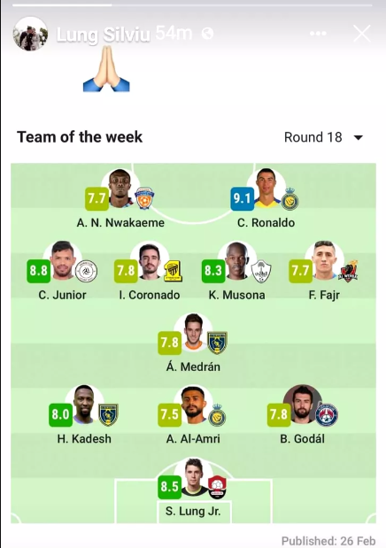 Silviu Lung Jr. (33 de ani) a avut o mulțime de intervenții la partida dintre Al Raed – Al-Ittihad, scor 0-0. Portarul român a fost eroul lui Al Raed și a fost băgat în echipa etapei în urma evoluțiilor sale reușite împotriva echipei care se clasează pe locul 2 în campionat. Fotbalistul antrenat de Marius Șumudică a primit punctaj 8.8. Silviu Lung Jr. a fost mândru de reușita sa și a postat o poză pe rețelele de socializare.