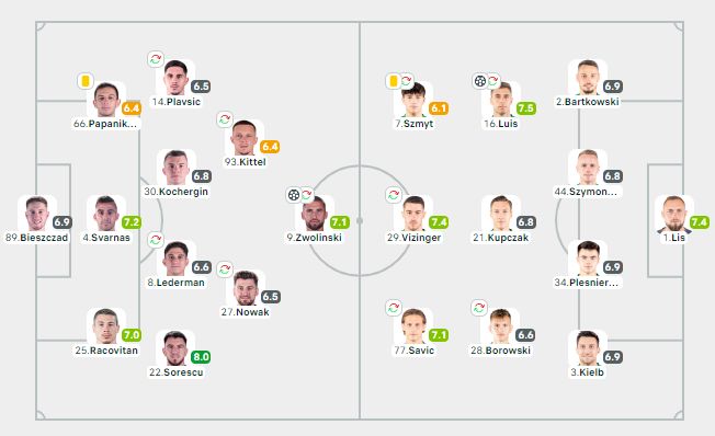 La scorul de 1-0 pentru Warta, în minutul 50, Deian Sorescu a obținut un penalty, iar Zwolinski l-a transformat. Oaspeții au preluat din nou conducerea în minutul 57.
