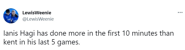 Să scăpăm de Ianis Hagi ar fi o mare prostie” / „Ianis Hagi a făcut mai mult în primele 10 minute decât a făcut Kent în ultimele sale 5 meciuri” / „E grozav să îl văd pe Ianis Hagi din primul minut și pe Alex Lowry din nou apt, abia aștept să îl văd la treabă azi pentru câteva minute”, au fost unele dintre comentariile postate de fanii lui Rangers pe rețelele de socializare, în cursul zilei de duminică.