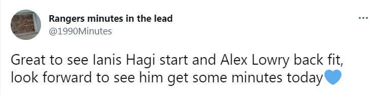 Această revenire a mijlocașului ofensiv în „primul 11” a fost salutată de către fanii lui Rangers, atât înainte de fluierul de start, când s-a aflat echipa trimisă în teren de antrenorul Michael Beale, cât și după începutul jocului și la finalul lui.