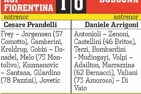 Decizia, menită să îl menajeze pe Mutu pentru viitoarele partide, nu a fost una care să afecteze echipa, ba, mai mult, majoritatea fazelor periculoase de poartă avute de echipa pe care Steaua o va vizita pentru al doilea meci din Ligă au fost opera lui Jovetic. Totuși, golul a venit de la experimentatul atacant Alberto Gilardino, care a marcat spre finalul primei părți cu capul. Repriza a doua a fost controlat în continuare de Fiorentina, dar golul nu a mai apărut, violeții fiind mai preocupați cu păstrarea rezultatului. Totul a ieșit conform planului și datorită apărării bine organizate, care nu a cedat presiunii puse mai ales pe final de Bologna. Astfel, Fiorentina a obținut prima victorie în campionat, și până la meciul cu Steaua va mai avea de jucat miercuri la Lazio și în weekend, acasă, cu Genoa.