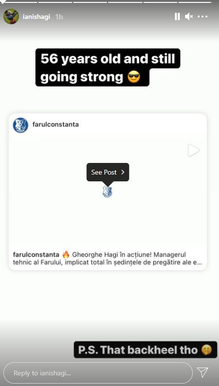 „56 de ani și încă se ține tare”, a scris Ianis Hagi, pe Instagram, unde a distribuit videoclipul postat de către cei de la Farul Constanța.