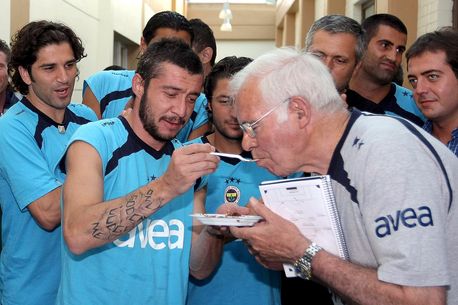 FOTO / Imagine din 28 iulie 2008, cu Luis Aragones sărbătorindu-și cea de-a 70-a aniversare alături de jucătorii lui Fenerbahce