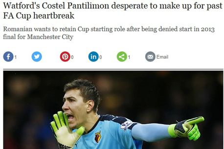 Cotidianul britanic The Telegraph scrie astăzi despre șansa lui Costel Pantilimon de a câștiga Cupa Angliei, ultimul trofeu major pus la bătaie în Anglia care îi lipsește românului din palmares, și dorința acestuia de a repara nedreptatea pățită în 2013, când juca la Manchester City. Atunci, deși a fost titular în toate meciurile jucate de City până în finală, românul a fost lăsat pe bancă în ultimul act, pe Wembley. Iar City a pierdut finala Cupei în fața lui Wigan.