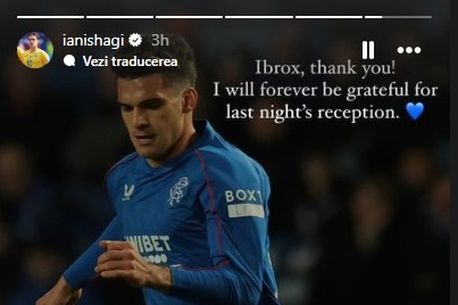 „Ibrox, mulțumesc. Voi fi veșnic recunoscător pentru primirea de aseară (n.r. duminică, 6 octombrie)”, a fost mesajul scris de Ianis Hagi într-un Insta Story.