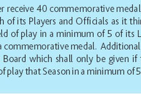 Campionii vor primi 40 de medalii comemorative ce vor fi oferite de reprezentanții clubului managerului, jucătorilor și oficialilor, cu condiția ca fiecare jucător care a evoluat în cel puțin cinci partide pe parcursul sezonului, în meciurile din campionat, să primească o medalie comemorativă din partea clubului. Medalii comemorative suplimentare pot fi oferite doar cu acceptul Ligii, accept ce va fi oferit doar dacă numărul jucătorilor care au evoluat în cel puțin 5 partide e mai mare de 39″.