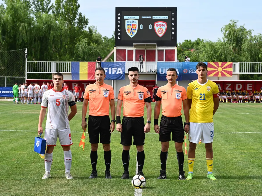 Brigada de arbitri formata din Nicusor Marin, Dan Buzarnescu si Nicusor Marin alaturi de Matteo Dutu la meciul amical de fotbal dintre Romania U18 si Macedonia de Nord U18, desfasurat pe stadionul din Tunari