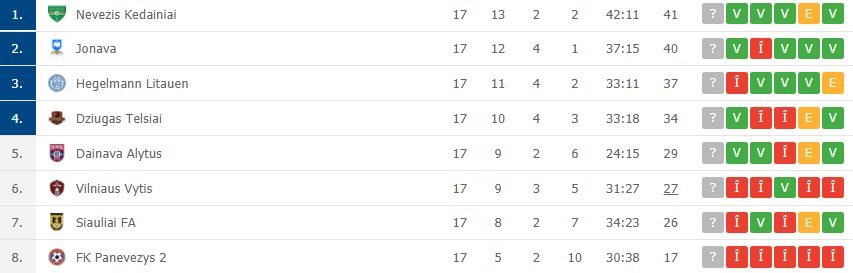 În liga a doua din Lituania, opt echipe dispută un play-off de promovare, iar primele patru clasate promovează în primul eșalon. Jonava și-a asigurat deja matematic accederea în prima ligă, având un avas de 11 puncte față de echipa de pe locul 5.