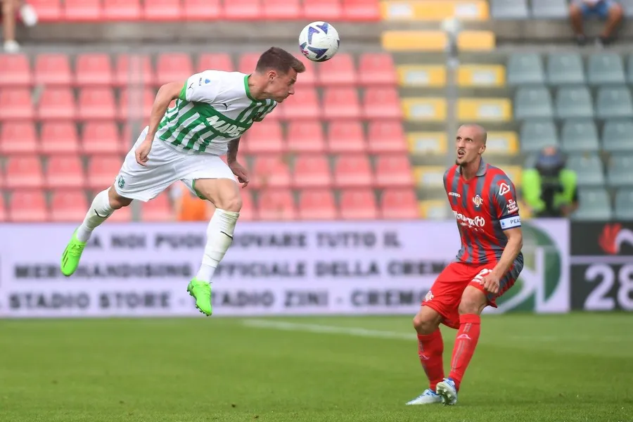 04 Settembre 2022 – Cremona, Italia – sport, calcio – Cremonese vs Sassuolo – Campionato italiano di calcio Serie A TIM 2022/2023 – Stadio Giovanni Zini. Nella foto: Andrea Pinamonti (#9 Sassuolo) vs Vlad Chiriches (#21 Cremonese)
