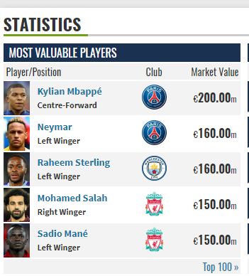 Cu toate acestea, Ronaldo sau Messi nu apar în topul celor mai scumpi jucători ai lumii, în ultimul clasament al celor de la transfermarkt.de. Site-ul amintit îl consideră pe Kylian Mbappe cel mai valoros jucător al lumii!! Cotat la 200 de milioane de euro, francezul le-a luat fața lui Neymar, cotat la 160 de milioane de euro, Rahem Steerling, cu aceeași cotă, Salah și Mane, de la Liverpool, cotați la „doar” 150 de milioane de euro.