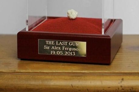 Ultimul meci al lui Ferguson la Manchester United a fost în mai 2013, 5-5 cu West Brom. A fost în deplasare și Sir Alex a primit din partea mascotei rivalilor un pachet de gumă. Ultima bucată a fost recuperată de un suporter și scoasă la vânzare pe eBay. „Gumă de mestecat folosită. RARĂ‚. Recuperată de pe The Hawthorns (n.red. stadionul lui West Brom). Cutie din lemn. I-a aparținut lui Sir Alex. După 1500 de meciuri în care a mestecat intens gumă, iat-o pe ultima. Suma va fi donată în totalitate Fundației Manchester United”, se arată în anunț.