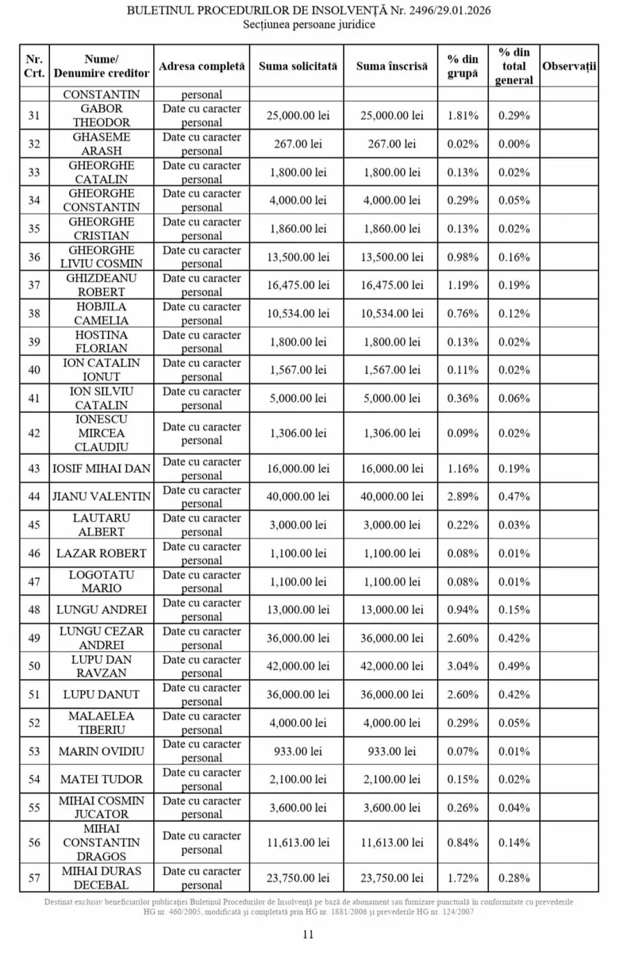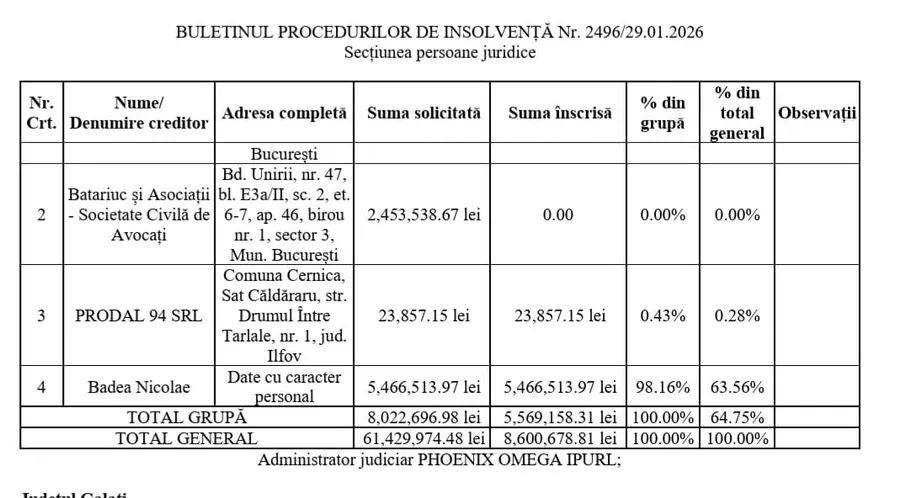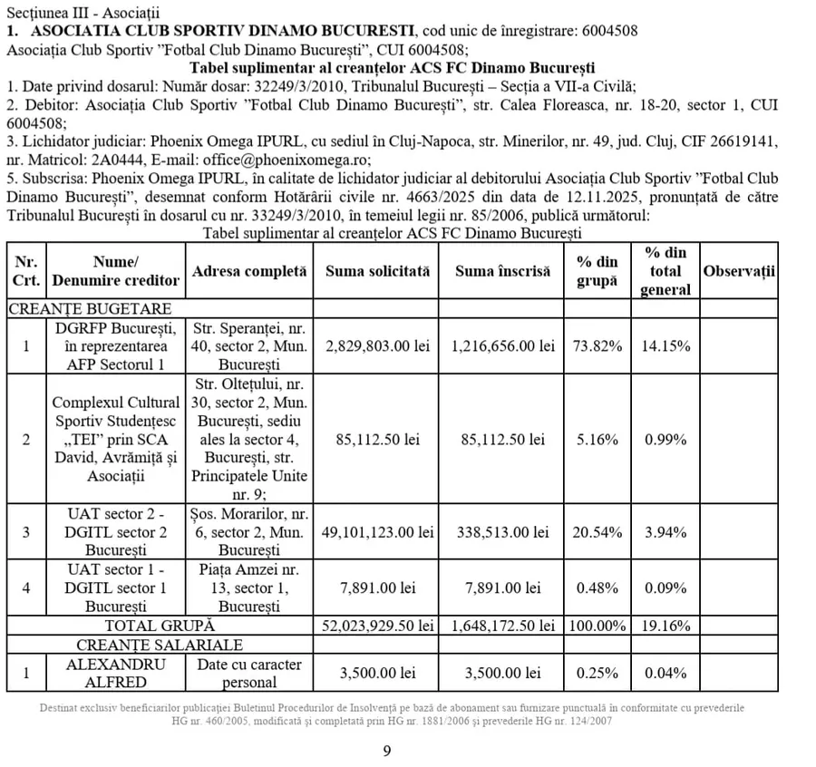 ProSport vă prezintă cine sunt aceștia și care sunt sumele totale înscrise, dar și cele acceptate de administratorul judiciar Phoenix Omega IPRL.