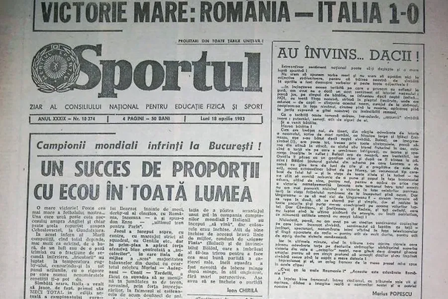 FOTO: prima pagină din ziarul Sportul după România – Italia 1-0, aprilie 1983