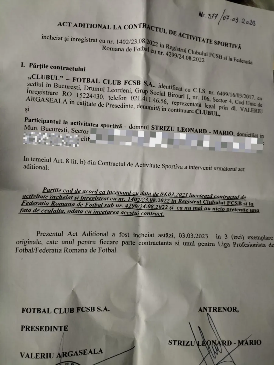 Însă, ProSport vă prezintă în exclusivitate documentul prin care Leo Strizu și FCSB închid oficial contractul de activitate al fostului antrenor principal. Actul respectiv a fost încheiat în trei exemplare.