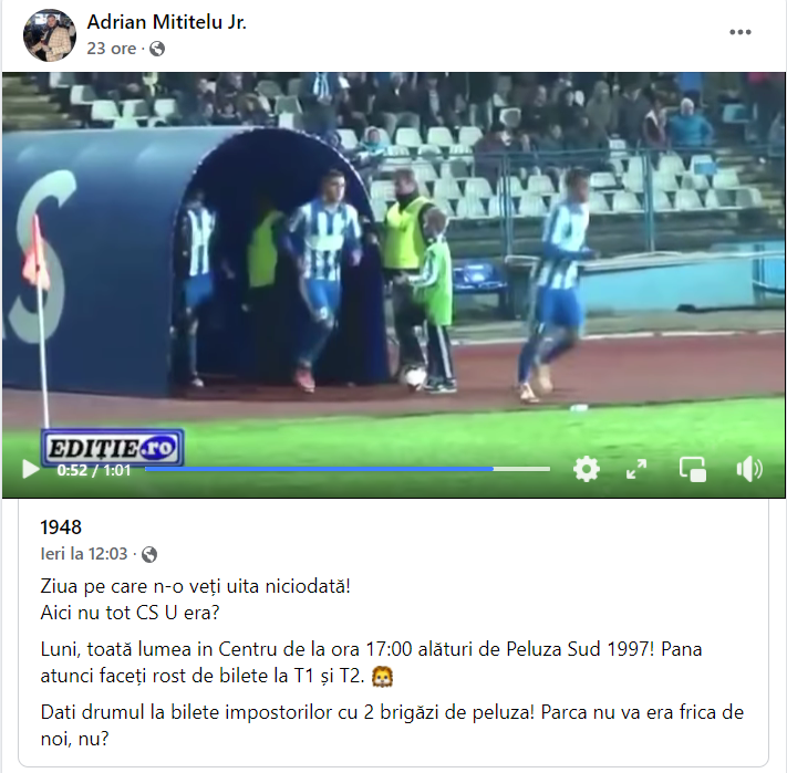 Mai mult, Adrian Mititelu Jr. le-a cerut suporterilor să își achiziționeze tichete la Tribuna 1 și Tribuna 2 pentru partida cu Universitatea Craiova.