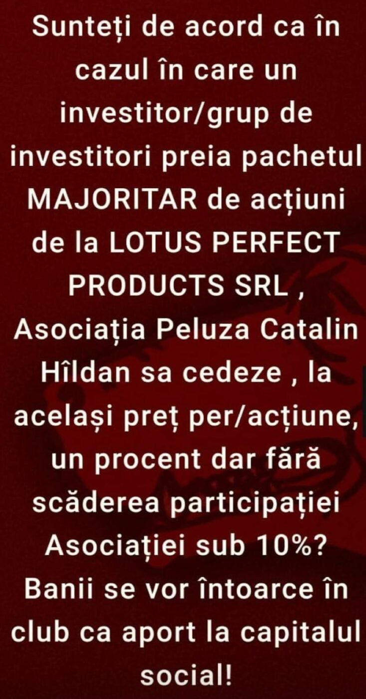„Sunteți de acord ca, în cazul în care un investitor/ grup de investitori preia pachetul majoritar de acțiuni de la LOTUS PERFECT PRODUCTS SRL, Asociația „Peluza Cătălin Hîldan” să cedeze, la același preț/acțiune, un procent, dar fără scăderea participației Asociației sub 10%? Banii se vor întoarce în club ca a port la capitalul social.”