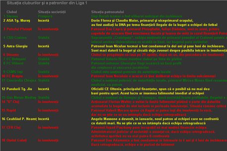 Liga 1 la fotbal are, în acest moment, 11 echipe care fie au intrat deja în administrare judiciară, fie sunt în mare pericol să ajungă în această situație. Petrolul, Dinamo, FC Brașov, „U” Cluj, Rapid, CFR Cluj și Oțelul sunt în insolvență, iar ASA Tg. Mureș, Astra, Pandurii și Ceahlăul au, de asemenea, diverse probleme care pot duce rapid către insolvență sau chiar faliment.