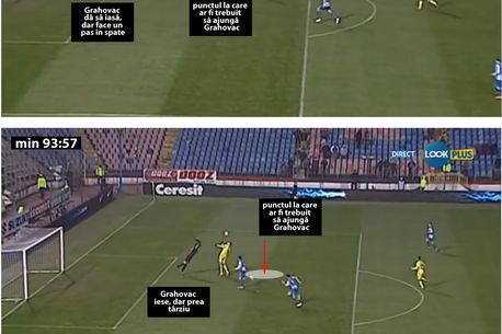 Analiza video a fazei arată că, deși i-a strigat colegului să lase mingea, Grahovac se comportă ca și cum așteaptă ca fundașul să respingă sau să-i paseze înapoi cu capul. Preț de două secunde, experimentatul portar bosniac (31 de ani) așteaptă lipit de linia de 6 metri, în timp ce Munteanu lasă balonul să treacă.