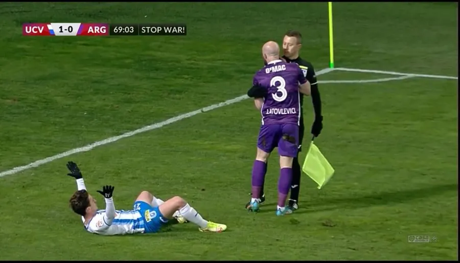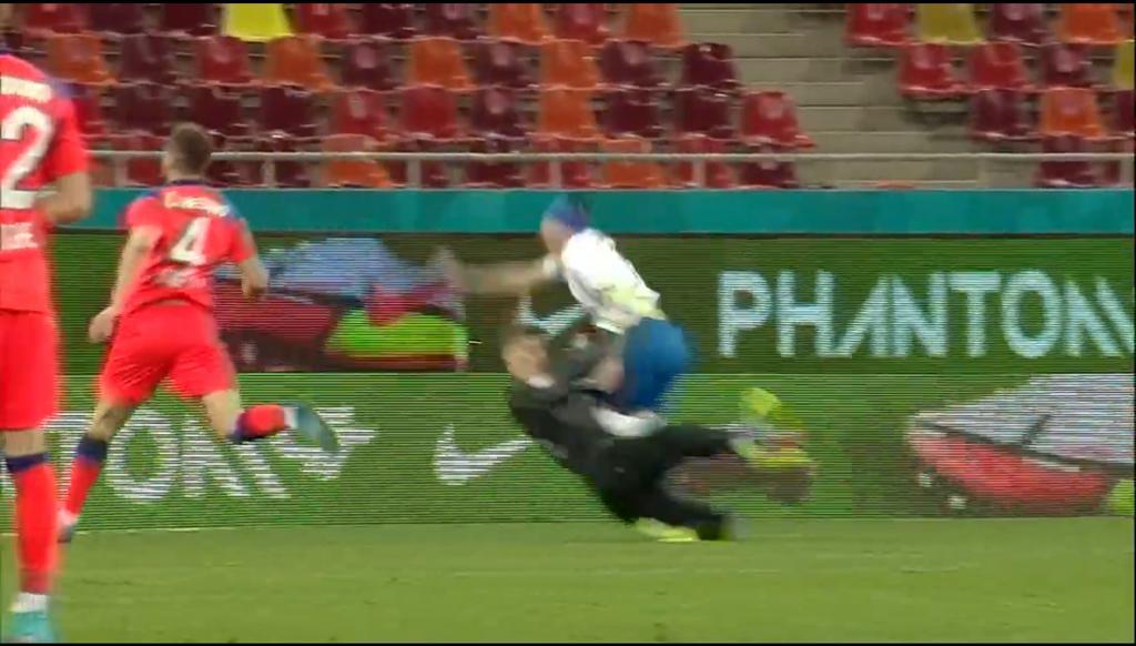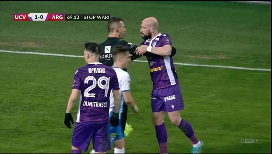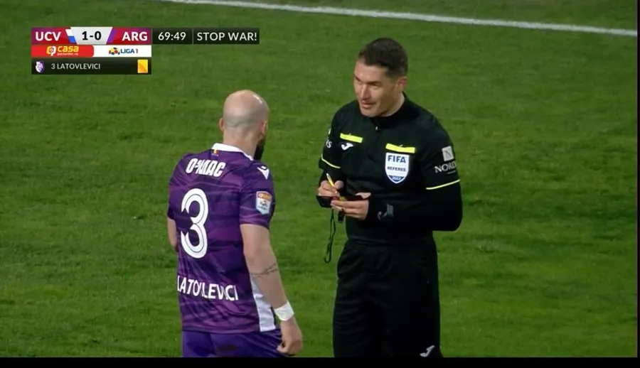 Ceea ce urmează este interesant de analizat. Intre Latovlevici și Artene se duce o mică luptă corp la corp, cu împingeri, țineri de braț, cuvinte adresate și de unul și de celalalt, fețe încruntate, de am avut impresia că o să se ia la bătaie. Revedeam cu ochii minții scena cu Ionel Ganea și Gabriel Mudura. Dacă jucătorului pot să îi înțeleg nervozitatea, tocmai fusese călcat pe față, ceea ce nu înțeleg este reacția arbitrului asistent.